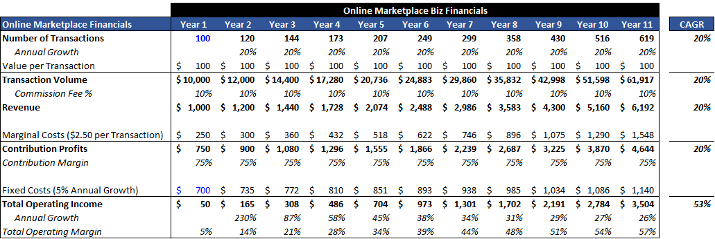 The greater the differential between historical profit margins and incremental contribution margins, the faster the business will grow profits for any given level of revenue growth. Operating income grows at 36% from years 3 - 11 vs 53% growth from years 1 - 11, because the starting operating margin is 21% in year 3 vs 5% in year 1 (and revenue growth is 20% every year in this example).