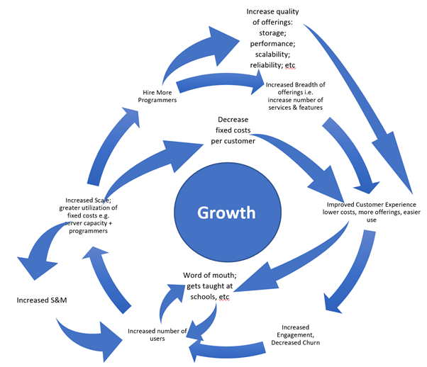 Scale Economies Shared businesses have a flywheel because their competitive advantages increase as the business grows larger, making it harder and harder for competitors to offer as much value to customers.