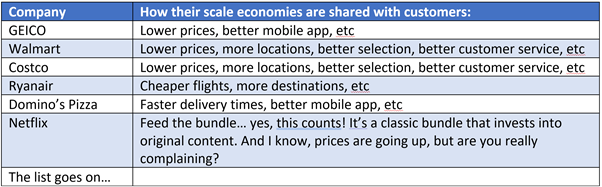 The most obvious example of “scale economies shared” is in businesses like Walmart and Amazon where scale enables them to lower prices for consumers – “sharing” that scale through price reductions.