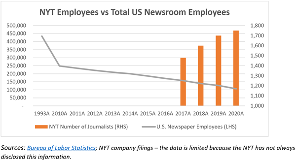 The NYT has economies of scale in content creation and highly attractive incremental economics, particularly in its digital subscription products. They’ve gained meaningful market share. The NYT has hired journalists while industry-wide the trend has been the opposite. The NYT has been able to hire great talent away from less financially-stable news organizations: