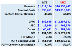 The table below demonstrates the impact this would have on free cash flow margins at each business if they were to stop spending on content creation entirely and did not see any corresponding drop in revenue. This is not feasible for either business today, nor will it ever be for the NYT. It’s worth considering for Netflix, however, as a thought experiment. Figures from 2019: