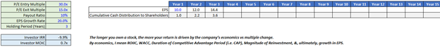 Let’s use a simplified DCF analysis to see what IRR (internal rate of return) and MOIC (multiple on invested capital) an investor generates investing in a company whose multiple gets cut in half (from 30x to 15x), with the following characteristics:
