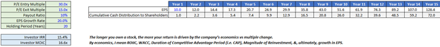 The longer an investor owns a business, the closer the investor’s IRR approximates the EPS growth rate of the business and the less the impact of the change in the company’s P/E multiple.