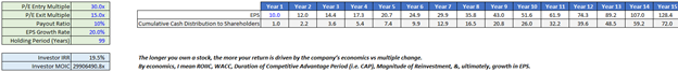 For a 99 year holding period, the IRR is 19.9% - virtually identical to the EPS growth. Of course, it would be very impressive if a business was able to sustain 20% EPS growth for a century, but you get the point!