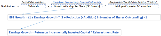 - Growth in EPS (which is a function of returns on incrementally invested capital and the reinvestment rate)